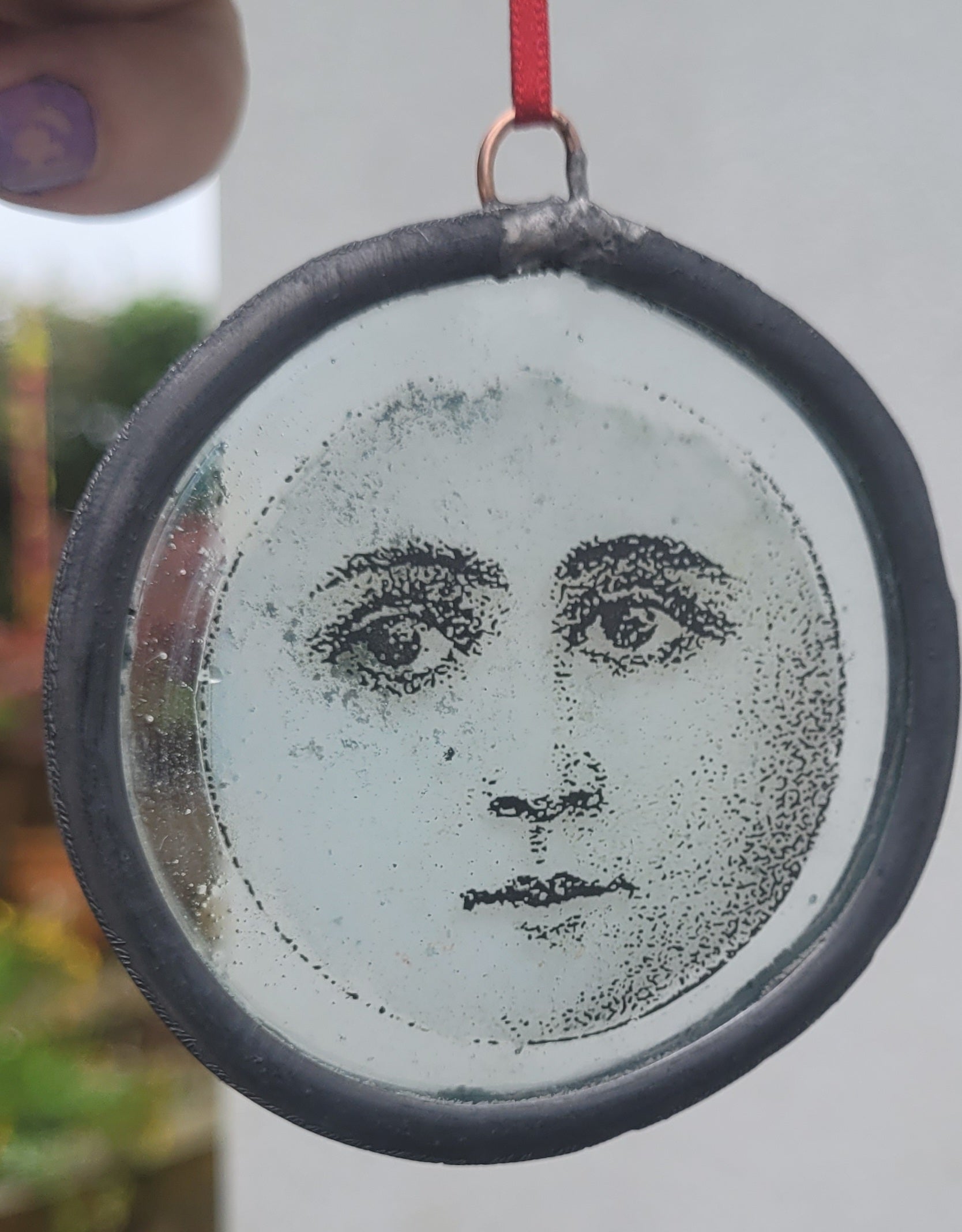 Hanging leaded fragment of the Moon. A permanently kiln fired piece of glass which has been traditionally leaded up with a soldered copper hoop on top so it can be hung in a window.